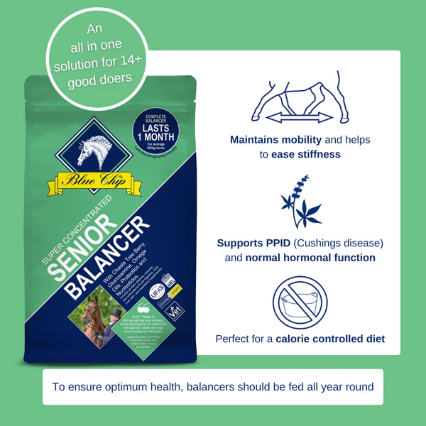 Blue Chip Super Concentrated Senior Feed Balancer is designed to support good doer horses and ponies as they age, helping maintain comfort, mobility, and overall wellbeing without adding unnecessary calories to the diet. The formula includes enhanced nutritional support for older horses, including ingredients to help support the onset of Cushing’s (PPID), alongside a complete…
