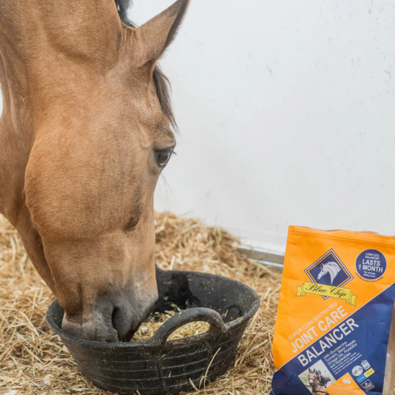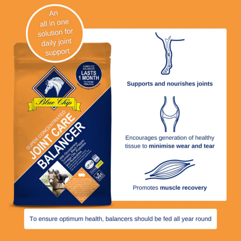 Blue Chip Joint Care Super Concentrated Balancer is not just an equine joint supplement. It’s an easy-to-feed, all-in-one feed balancer formulated to support joint health, comfort, and ease of movement from the inside out. Harnessing the natural power of turmericblack pepper and natural oils, alongside glucosamine, Joint Care helps minimise wear and tear, supports and nourishes joints and promotes muscle recovery.