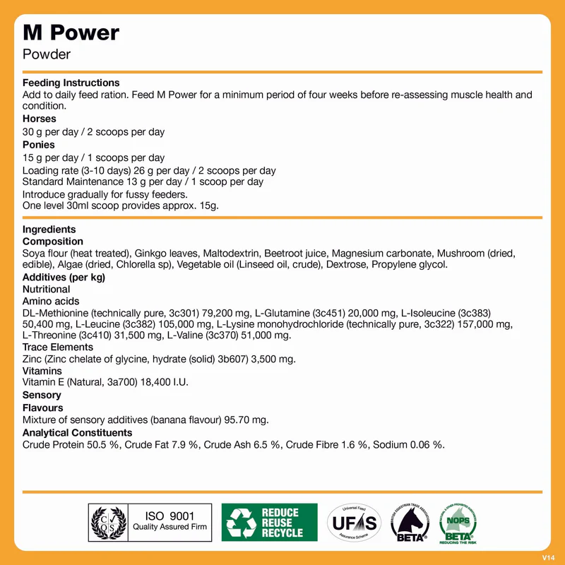 Clean Sport: M Power is audited under the BETA NOPS Scheme as suitable for FEI competition. Check local authorities if racing or competing internationally.